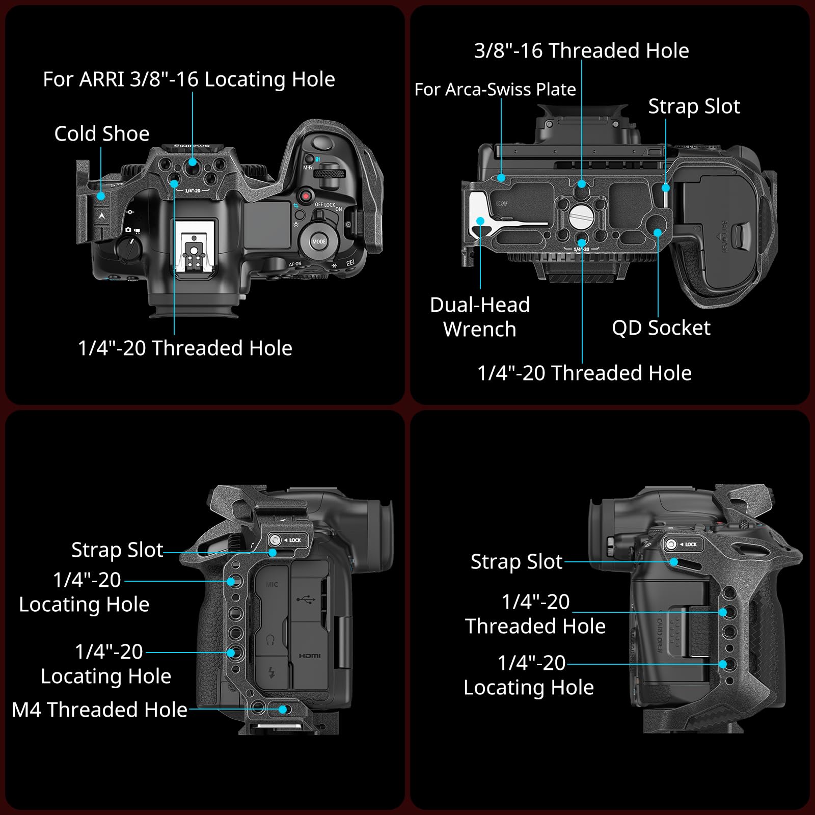 - Múltiples Opciones de Montaje: El kit de jaula para Canon EOS R5 II cuenta con orificios roscados incorporados de 1/4"-20 y 3/8"-16, para orificio de ubicación ARRI 3/8" -16, Zapata, interfaz QD, ranura para correa y otras interfaces de múltiples especificaciones, que se pueden combinar con varias soluciones de expansión. Cuenta con soporte de zapata fría HawkLock, placa de liberación rápida HawkLock para Arca-Swiss para mejorar la eficiencia del trabajo.