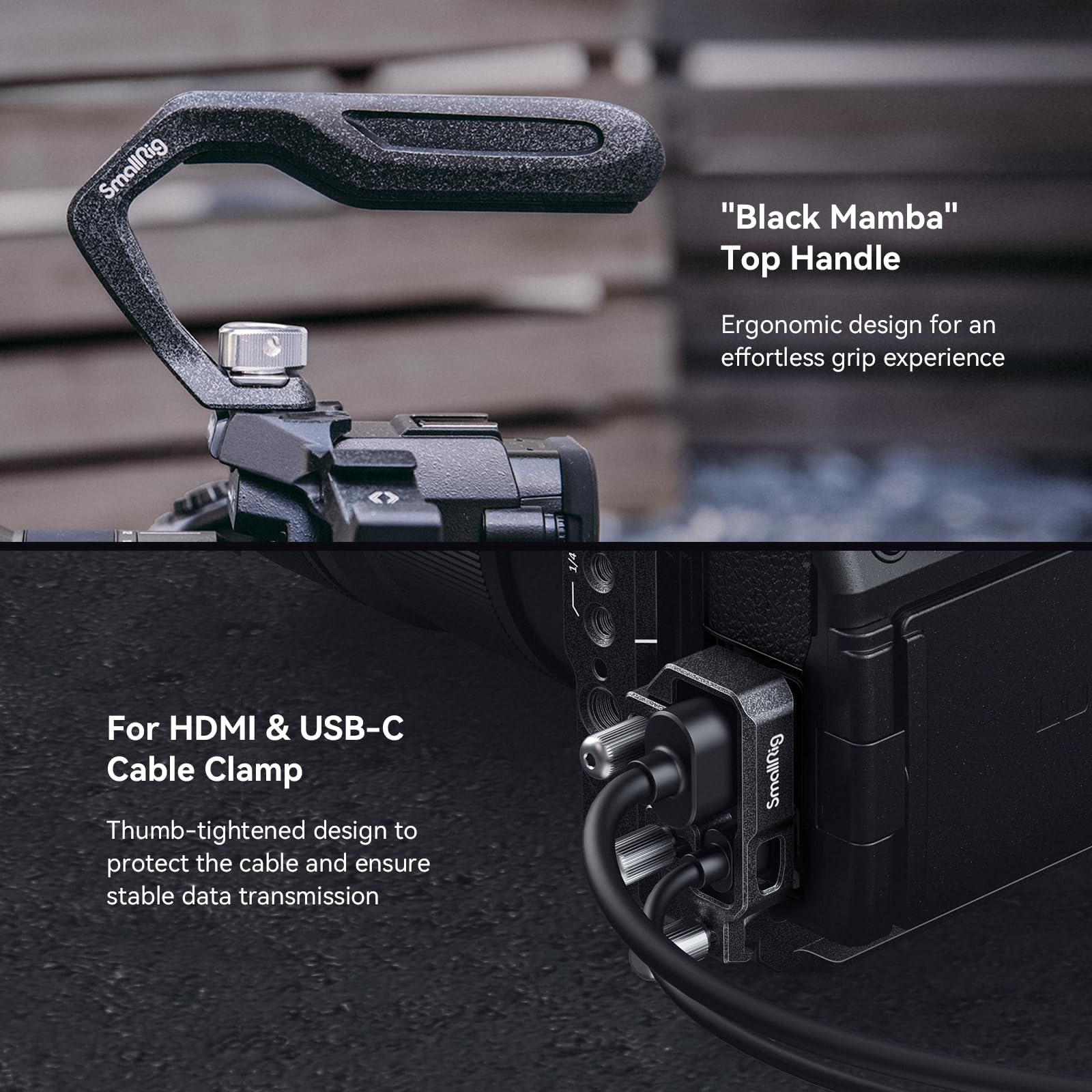 - Ligero y Eficiente: Equipado con un asa superior ergonómica "Black Mamba", proporciona una experiencia de disparo manual más cómoda y estable. Incluye una abrazadera de cable HDMI y USB-C que utiliza tornillos apretados a mano para una liberación rápida, lo que garantiza una transmisión segura de datos.
