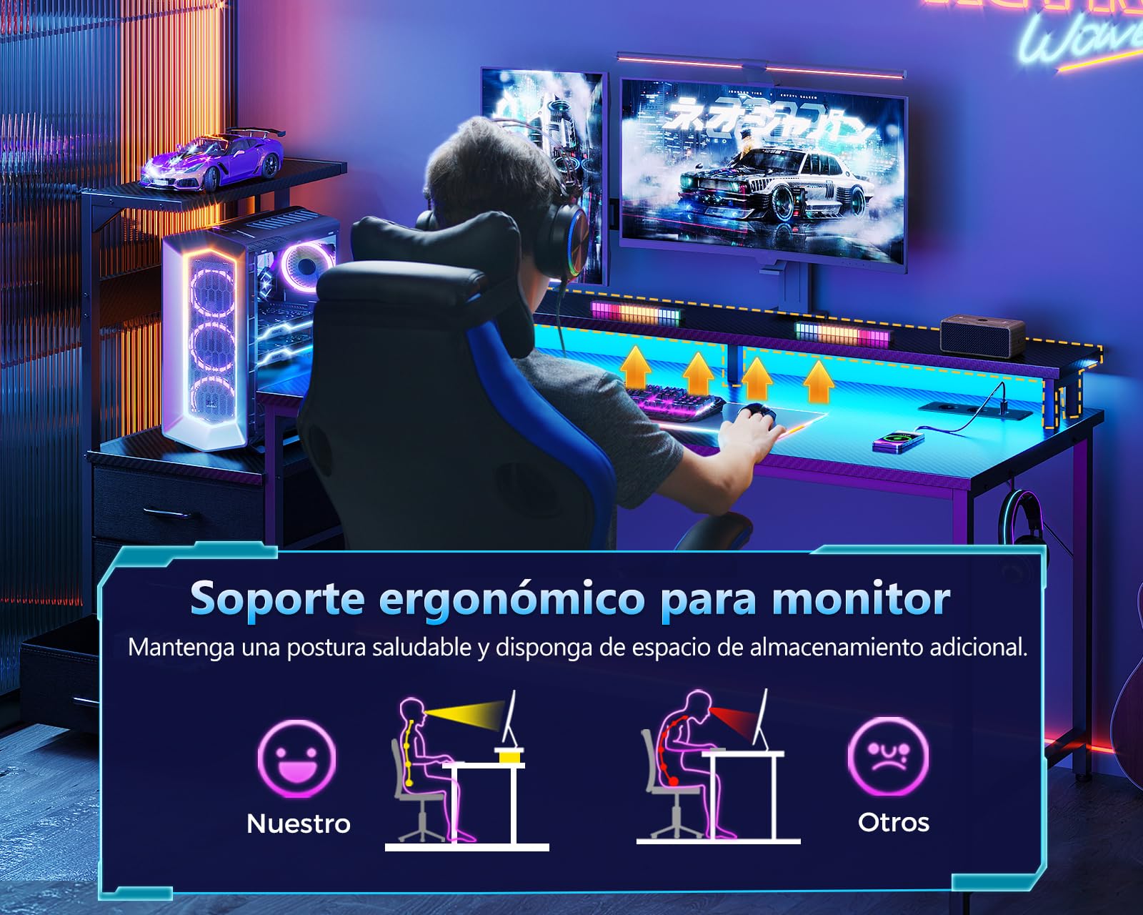 - 【Puertos de Carga USB y Tomas de Corriente】 El escritorio gaming está equipado con 2 tomas de corriente y 2 puertos de carga USB para sus dispositivos electrónicos, puede cargar fácilmente hasta 4 dispositivos electrónicos como teléfonos inteligentes, equipos de juego y dispositivos Bluetooth mientras trabaja, estudia o juega. ¡Deje que este escritorio de ordenador añada más comodidad a su vida!