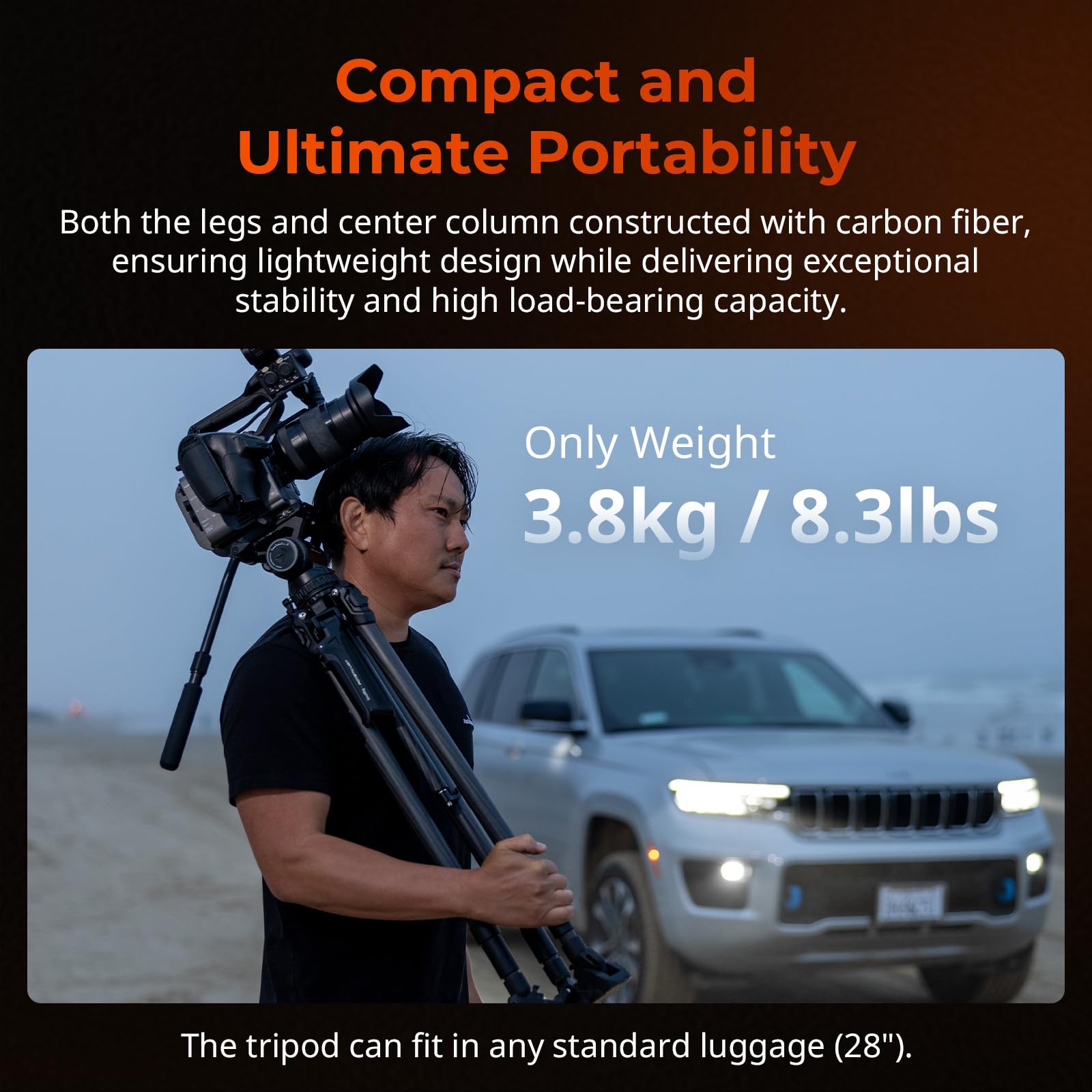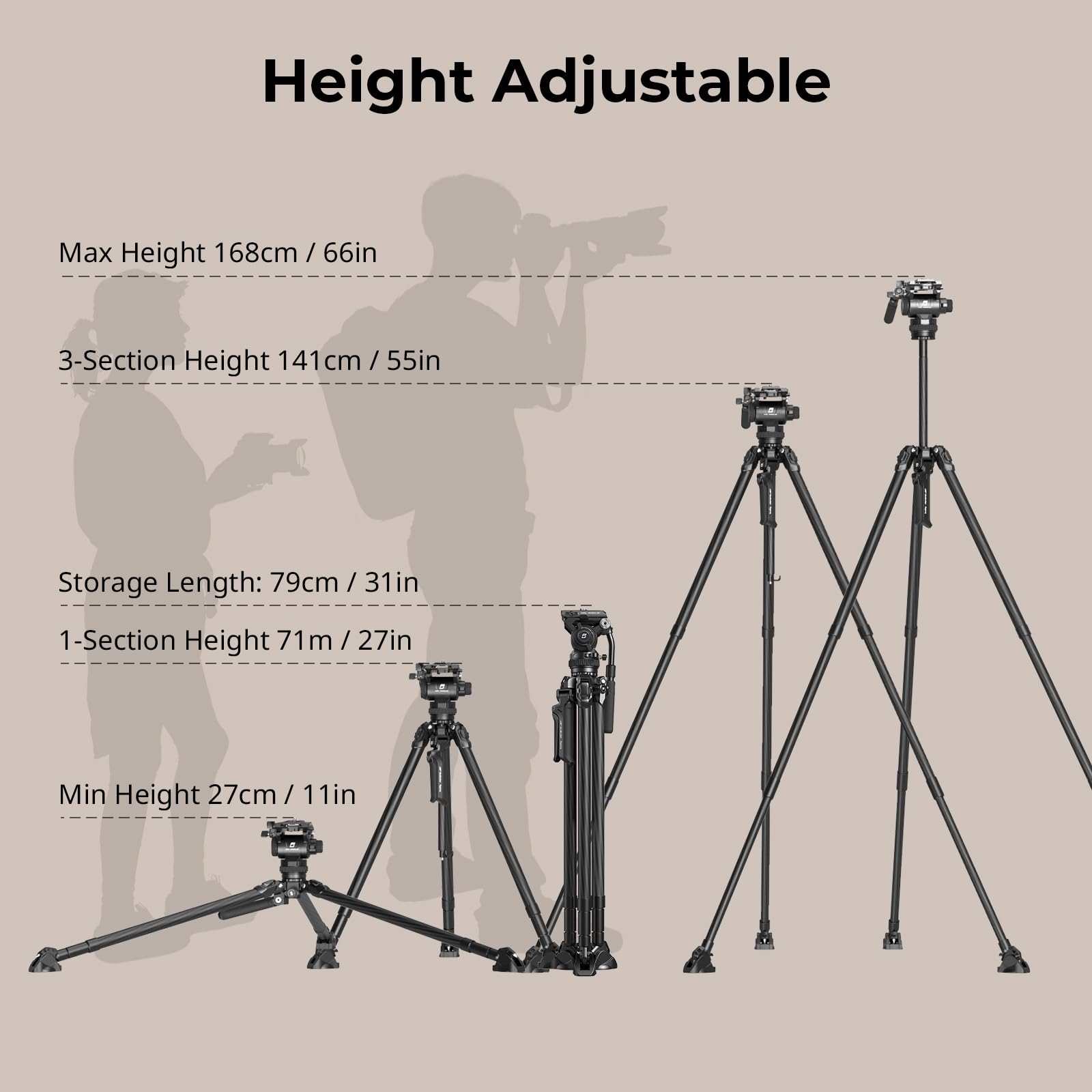 - Ligero y Fácil de Transportar: El trípode hidráulico para cámara está construido con fibra de carbono, lo que garantiza un diseño liviano, pesa solo 3,8 kg / 8,3 lb. La columna central presenta un diseño de bloqueo rápido para facilitar los ajustes de altura y se puede quitar para disparar en ángulo bajo a una altura mínima de 27 cm (10,6 pulgadas), con una llave Allen desmontable incorporada en el gancho para el montaje / desmontaje. Una altura que varía de 10,6" a 66,1" (27 cm a 168 cm) y una longitud de almacenamiento de 31" (79 m).