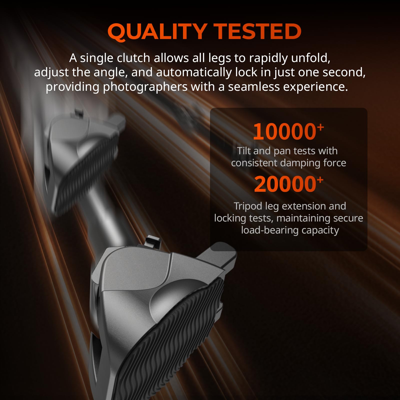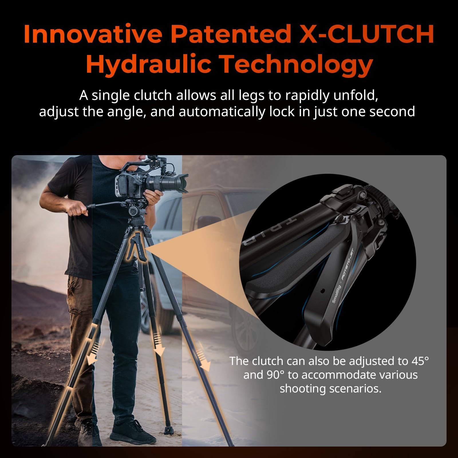 - Tecnología Hidráulica Patentada X-CLUTCH: El kit de trípode de fibra de carbono TRIBEX con tecnología hidráulica X-Clutch, al apretar un solo embrague, todas las patas se despliegan rápidamente, ajustan el ángulo y se bloquean automáticamente en solo un segundo, lo que brinda a los fotógrafos una experiencia perfecta. El embrague también se puede ajustar a 45° y 90° para adaptarse a varios escenarios de disparo.